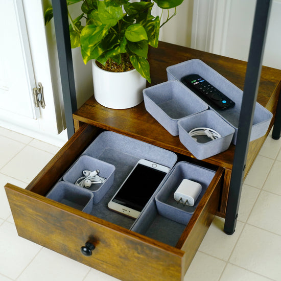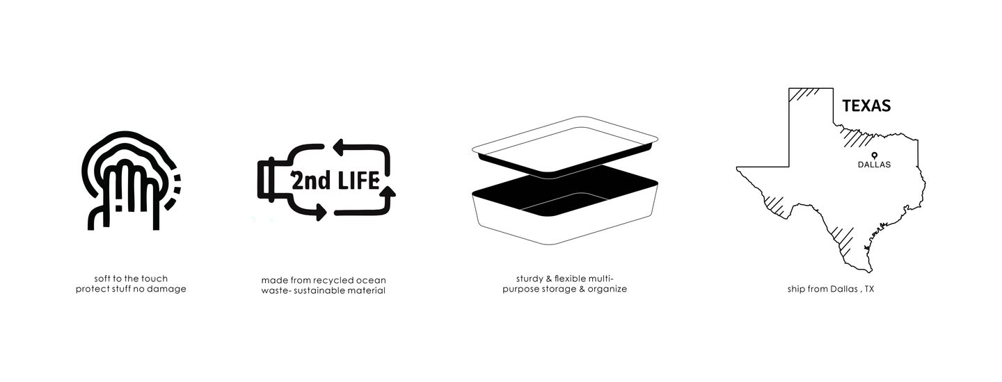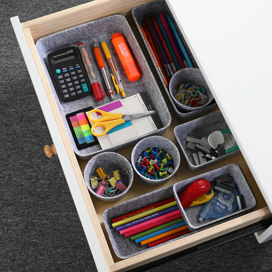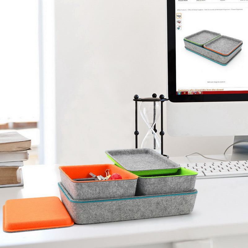Sustainable material of recycled felt with comfortable touch feeling. no noisy like plastic , keeps stuff from flying around in the drawer. soft to prevent scratching, flexible for space saved up on desk, kitchen,bathroom or anywhere you desire with these stylish storage and organizer bins.
